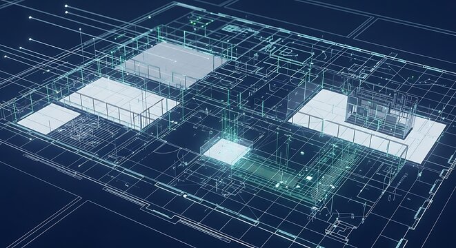 A futuristic digital network of glowing blue squares and lines against a dark background, symbolizing data connectivity, technology, or cyber infrastructure.