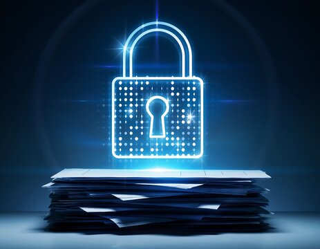Glowing digital padlock icon hovering over stack of paper documents, cyber security and data protection concept.