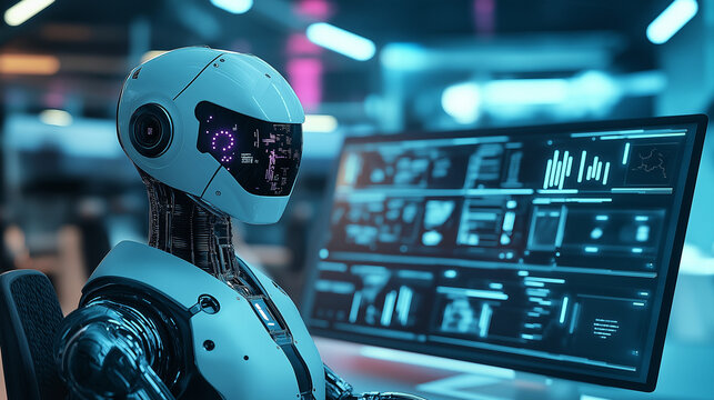 Futuristic artificial intelligence robot working as a data analyst or cybersecurity specialist in a high-tech office environment, surrounded by multiple computer screens displaying complex code