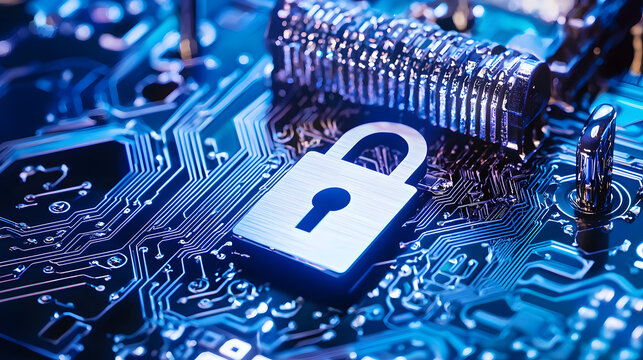 Futuristic digital padlock on circuit board concept