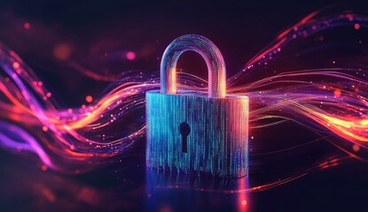 Glowing padlock icon on dark background with abstract data streams