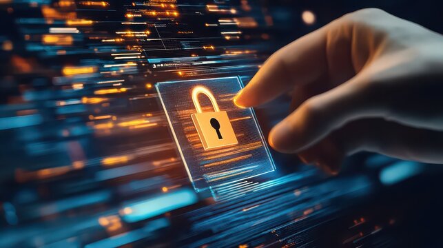 A digital hand interacting with a glowing padlock icon on a futuristic interface with data streams