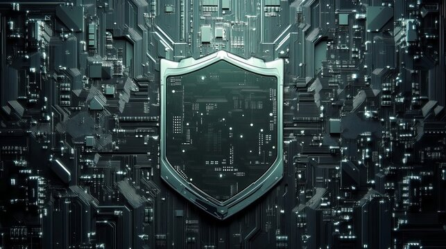An intricate circuit board with a shield design accentuating digital defense and technology innovation concepts.