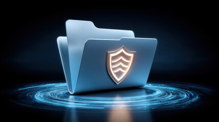 Secure digital folder with glowing shield emblem data security symbol in dark cyber environment conveying protected information and safe storage