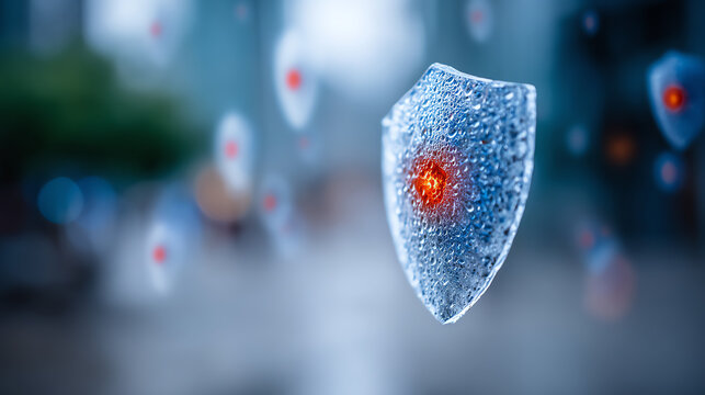 A close-up of a shield symbol on a rainy glass showing digital protection concepts and security themes in urban settings.