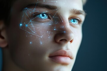 Close up of human eye with futuristic digital interface overlay, showcasing advanced technology and innovation. eye reflects sense of curiosity and wonder about future