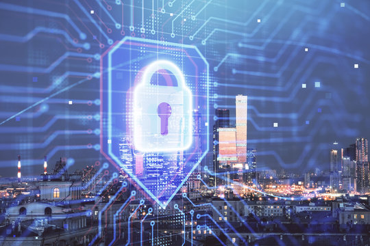 Double exposure of desktop with computer and lock icon hologram. Concept of data safety.