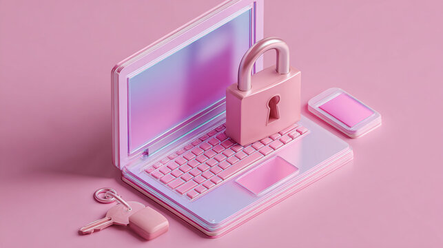 Data protection concept, featuring a laptop, lock, and key in a soft pink hue, symbolizing security and privacy. The scene is clean and modern