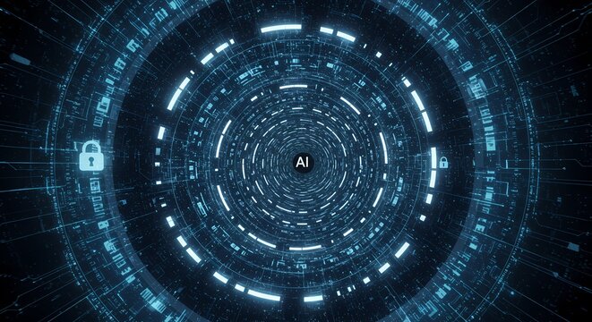 Abstract AI Data Tunnel with Glowing Circuitry and Security Locks.
