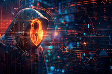 An abstract digital background with a hooded figure and a glowing padlock, highlighting the concept of cyber security