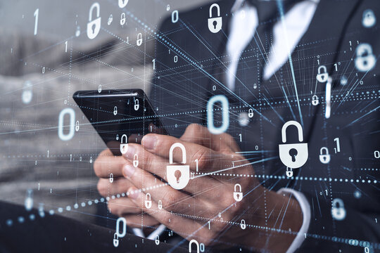 A programmer is browsing the Internet in smart phone to protect a cyber security from hacker attacks and save clients confidential data. Padlock Hologram icons over the typing hands. Formal wear.
