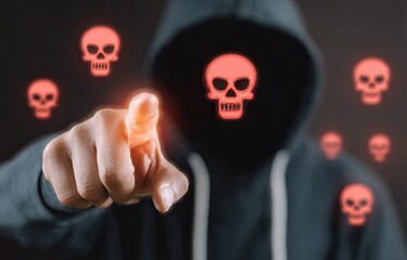 Person in a hooded jacket points finger at glowing red skulls