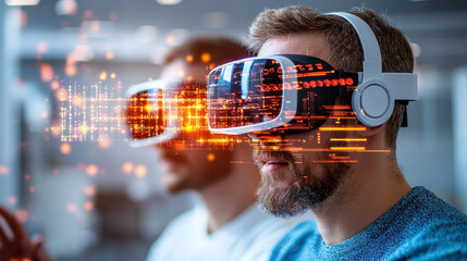 Immersive virtual reality experience with cybersecurity experts using VR glasses. They interact with digital data visualizations, showcasing advanced technology and innovation
