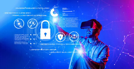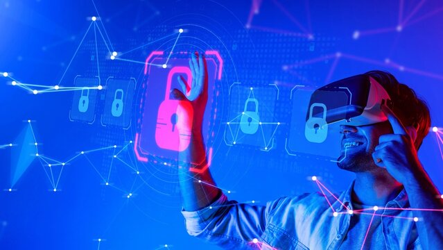 A young man enjoys a virtual reality experience while interacting with digital lock symbols, highlighting themes of cybersecurity in a vibrant and futuristic atmosphere. Raster