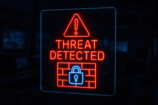 Threat detected warning signals indicate cybersecurity risk and data protection alert