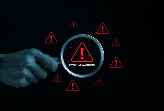 Man use laptop, digital alert symbols hover over keys, concept of cyber security and data protection. System hacked warning alert. Cyber attack on network, Virus, Spyware, Malware, Malicious software.