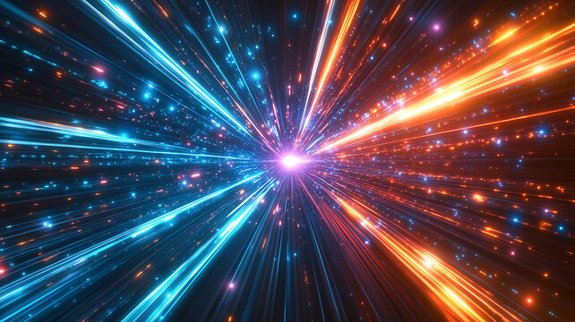 Abstract space-time warp tunnel with glowing blue and orange light streaks, futuristic speed motion background
