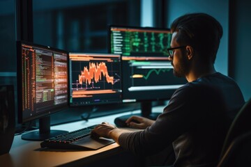 A man in a suit is sitting at a desk with multiple computer monitors in front of him. He is focused on his work, possibly analyzing data or managing a project. The room is well-lit and organized