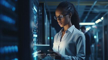 Network technician inspecting server rack with tablet wearing hi-vis vest and earmuffs