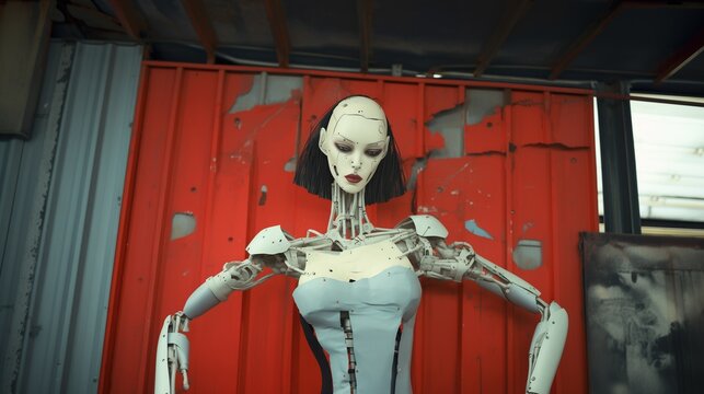 Cyberpunk slum junkyard cyber female robot, imperfect and expired scrap metal android with  bald head, exaggerated humanoid features.