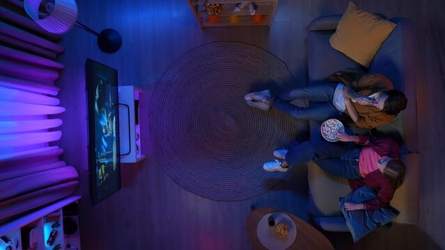 Top view of couple sitting on the couch in the living room, watching movie on TV eating popcorn.