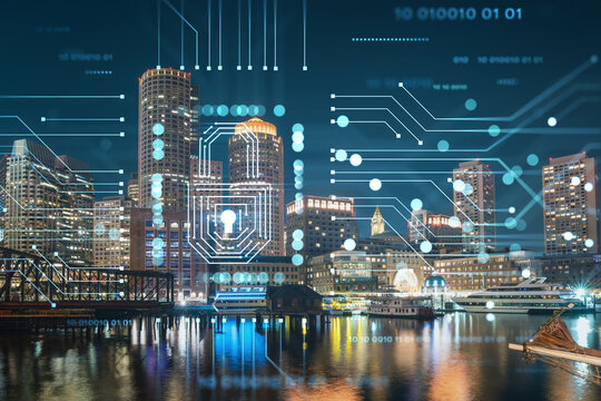 City view panorama of Boston Harbor and Seaport Blvd at night time, Massachusetts. Building exteriors of financial downtown. Glowing Padlock hologram. Concept of cyber security to protect information