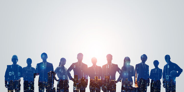 Group of multinational businesspeople and digital technology concept. Wide angle visual for banners or advertisements.
