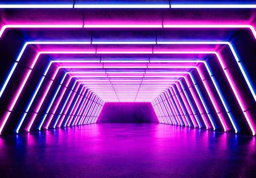 Red virtual abstract background space tunnel with neon line lights. Reality square portal arch tunnel. Spectrum vibrant colors laser show.