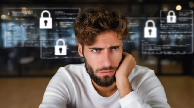 Worried employee discovering data breach on office computer screen