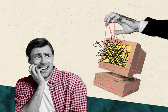 Collage artwork graphics picture of afraid scared guy have cyberattack obsolete gadget isolated painting background