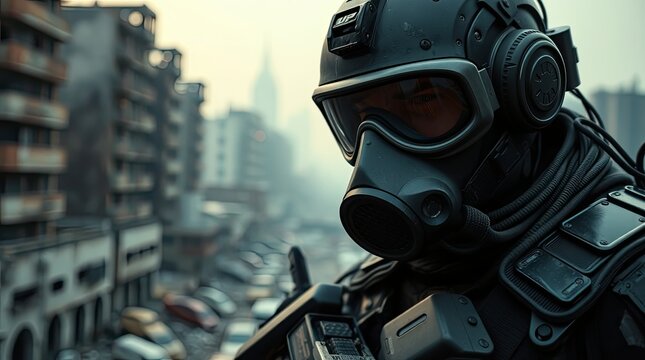 A cybernetic soldier stands guard amidst the ruins of a city clad in advanced armor and a gas mask vigilant in an uncertain future