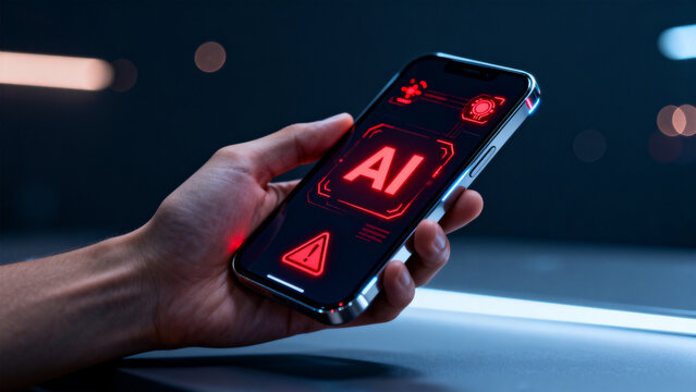Hand holding smartphone with AI display