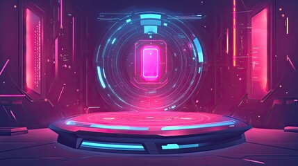 Futuristic empty platform displaying a vibrant neon portal and intricate cybernetic details, creating an immersive virtual reality or digital showcase environment
