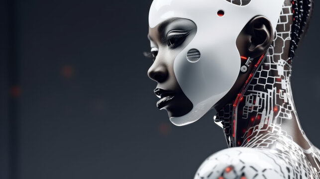 A woman cyborg robotics android as afroamerican robotics aspect. White lucid shell for bionic cyborg and afro americans inclusion. Black robotic lifes