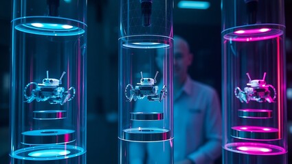 Generative AI advanced robotic units within illuminated displays.