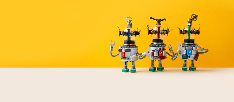Three funny alien ufo robots, yellow wall background. Sky fi mechanical fantasy characters with arms springs metal torsos, glass heads. Copy text