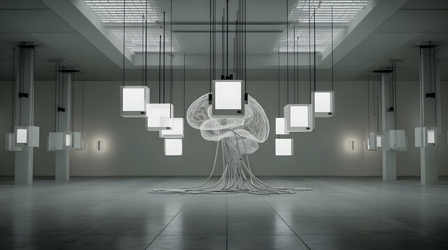 interface connected to cybernetic cables and floating digital cubes in a sci-fi lab environment