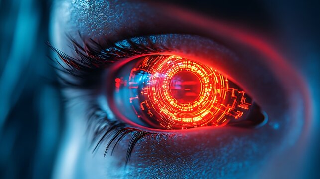 Cybernetic eye scanning red hud reticle and futuristic optic implant closeup for ai interface