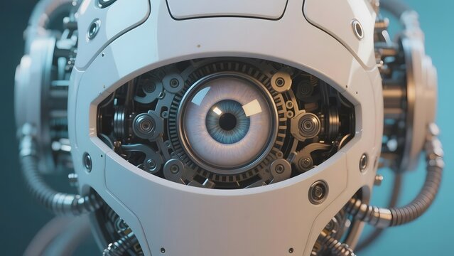 Mechanical Eye: Futuristic Robot Head with Intricate Gears and Human-like Iris