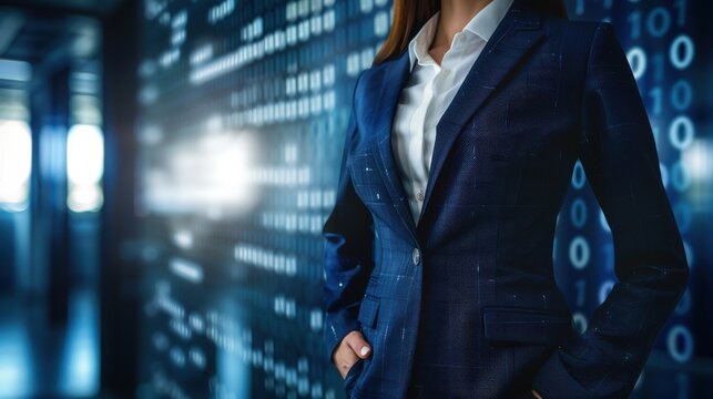 Female CEO in charcoal grey suit, torso view, reviewing global trade report, modern office backdrop, representing global commerce expertise, cybernetic tone, Analogous Color Scheme