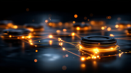 Futuristic black circular nodes connected by glowing orange lines, network visualization on dark surface, dramatic lighting and depth effect, defocused connections, with copy space
