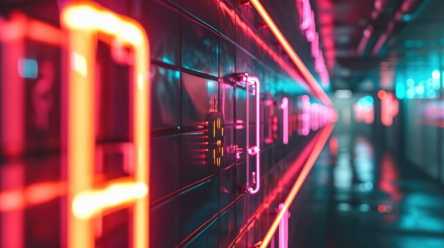 Vibrant cyberpunk tunnel with neon lights and reflective surfaces