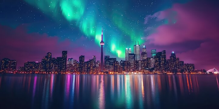 A cyberpunk city skyline where artificial auroras light up the neon skyline.