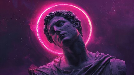 A classical marble statue head is illuminated by a neon pink halo against a dark, starry background, blending ancient art with futuristic, cyberpunk aesthetics