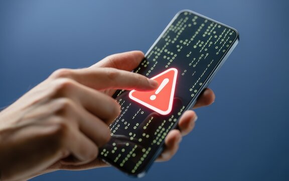 Person holding a smartphone with a security alert, virus warning, or system error notification on the screen