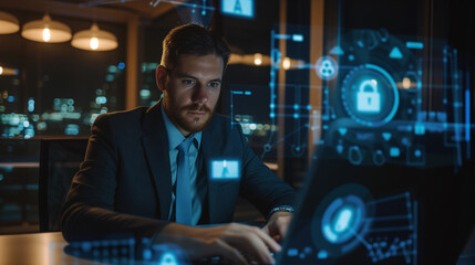 Businessman Working on Cybersecurity Strategy with Virtual Interface