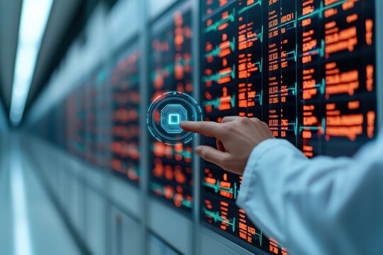AI Healthcare Cybersecurity concept. Futuristic interface interaction with digital data display.