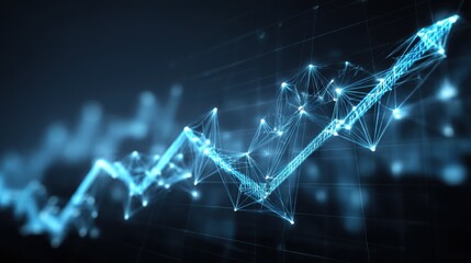 Abstract digital stock market graph with glowing blue lines and dots representing upward trends in financial data analysis and technology visualization