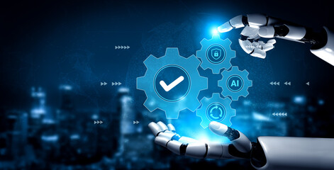 A robotic hand engages with digital gears and interface symbols, signifying the merging of technology with automation and artificial intelligence concepts in a modern setting. Gantry