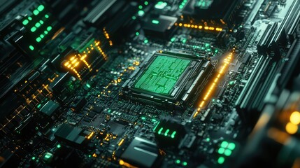 Close up of cpu processing data on motherboard, showcasing futuristic technology